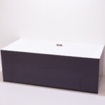 Fritstående badekar med dybsort afskærmning og hvidt inderkar.