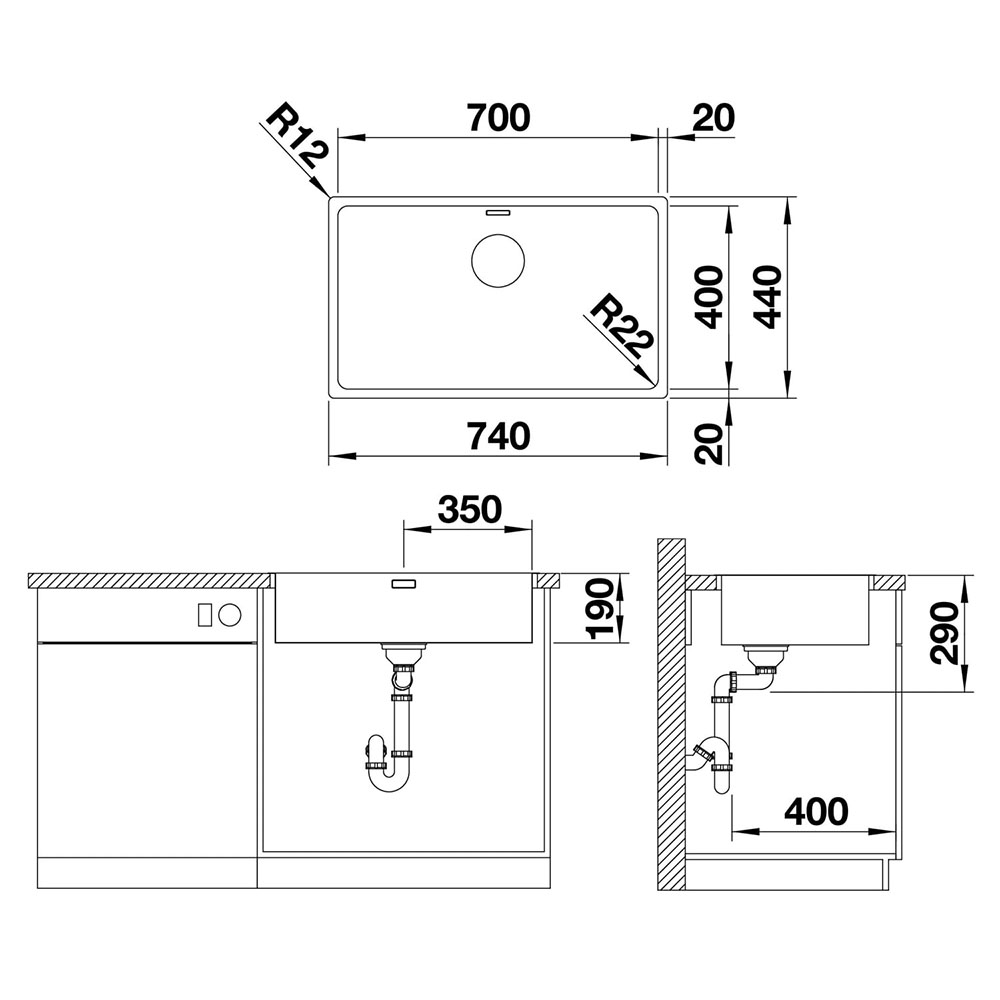 BLANCO ANDANO 700-IF/N UXI køkkenvask i rustfrit stål 74 x 44 cm, 80 cm skab, med manuel afløbsbetjening og InFino 3½’’ afløbssystem, uden afløbsbakke, til ilægning/ planlimning