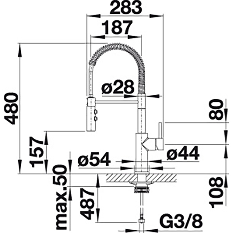 Blanco Catris-S køkkenarmatur med fleksibel slange og to stråletyper – en kraftig skyllestråle samt en brusestråle, der er god til at rense/vaske grøntsager. Armaturet er en høj model, hvorfor montering anbefales i en køkken-ø, eller hvor der ikke er overskabe.