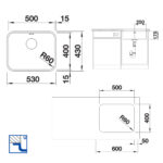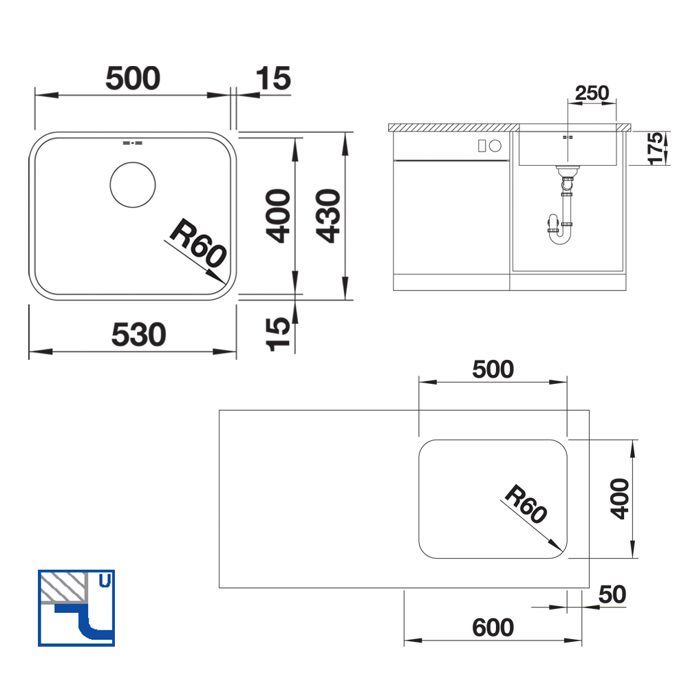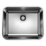 BLANCO SUPRA 500-U UX køkkenvask i rustfrit stål 53 x 43 cm, 60 cm skab, med manuel afløbsbetjening og 3½’’ afløbssystem, uden afløbsbakke, til underbygning.