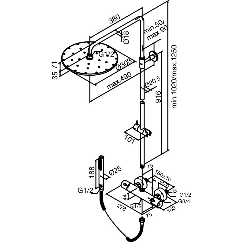 Dette flotte brusesystem har en hovedbruser med en diameter på 300 mm, der giver en dejlig følelse under badet. Brusesystemet har ligeledes en håndbruser, hvor man nemt via den integrerede omskifter kan vælge mellem hånd- og hovedbruser.