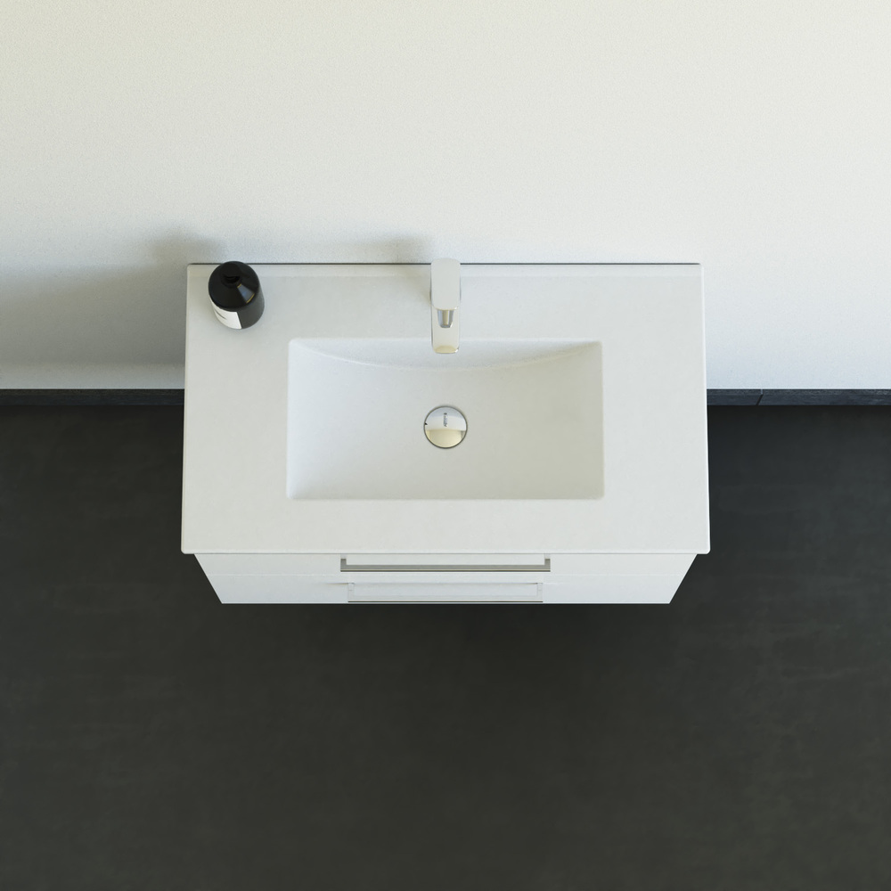 Til alle fronter medfølger som standard et greb i krom, der er inkluderet i prisen. Dina håndvasken i sanitetsporcelæn er en stor håndvask med et tidløst og minimalistisk design med tynd bordplade og bassin med geometrisk stram udformning. Sanitetsporcelæn er et stærkt materiale, med et blødt og afrundet design på alle kanter i både bassin og bordplade.