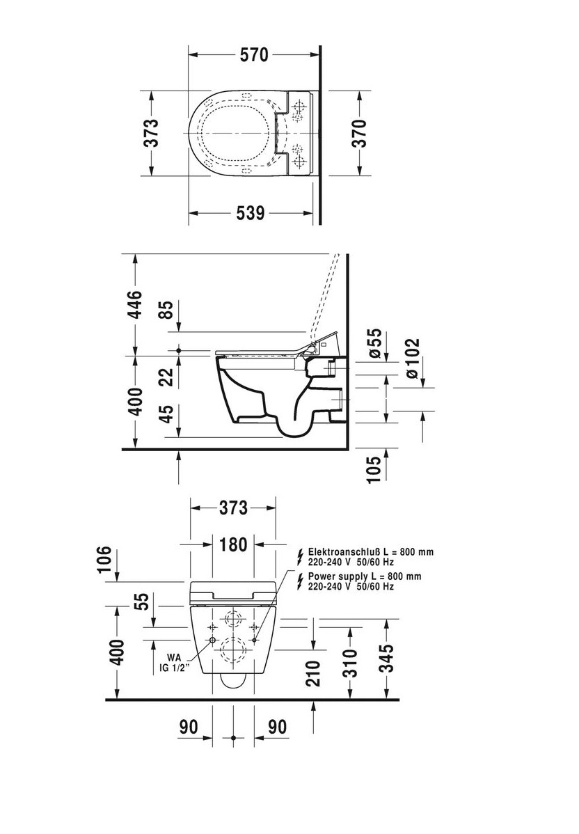 Duravit ME Starck SensoWash vægtoilet 370×570 mm. Åben skyllerende. WonderGliss.