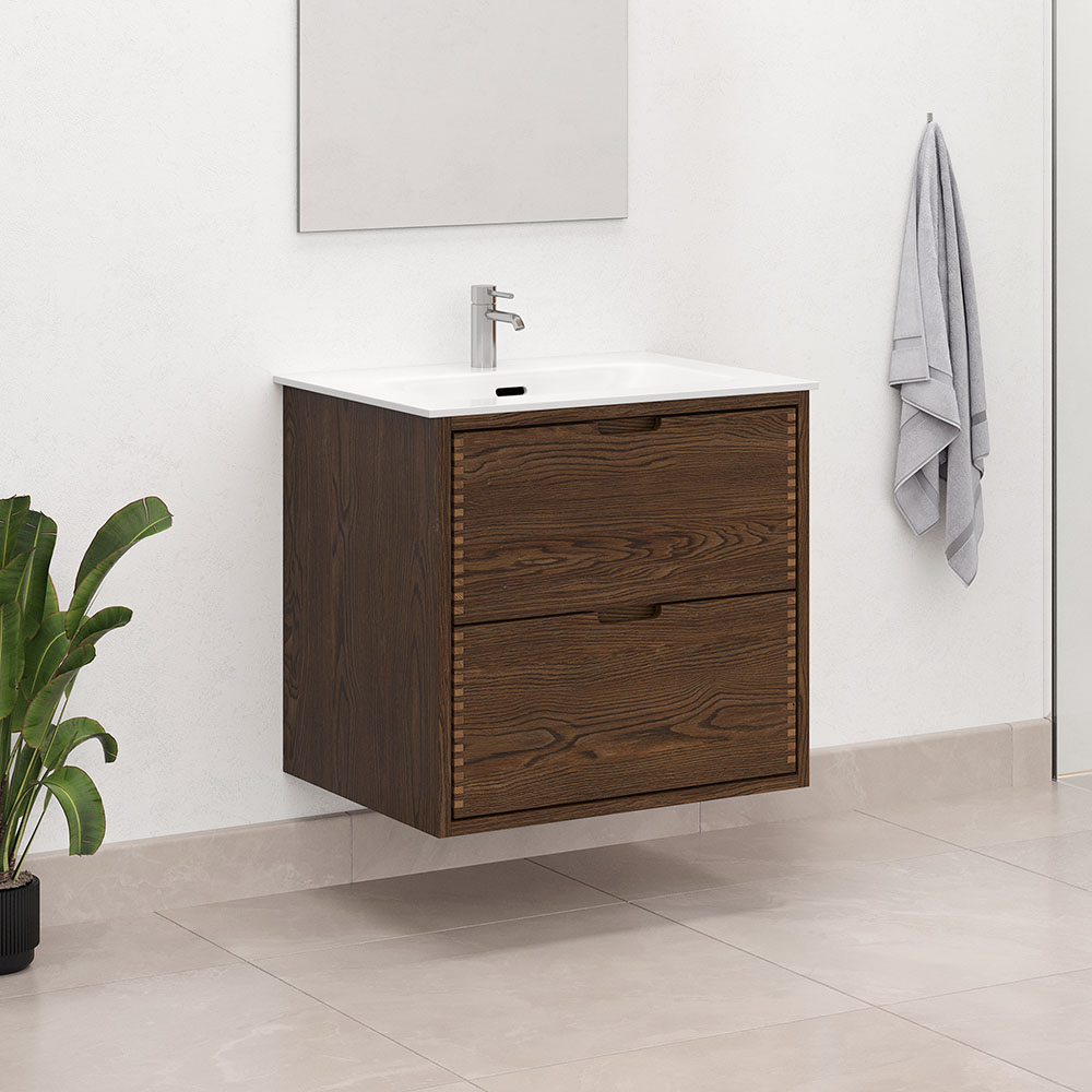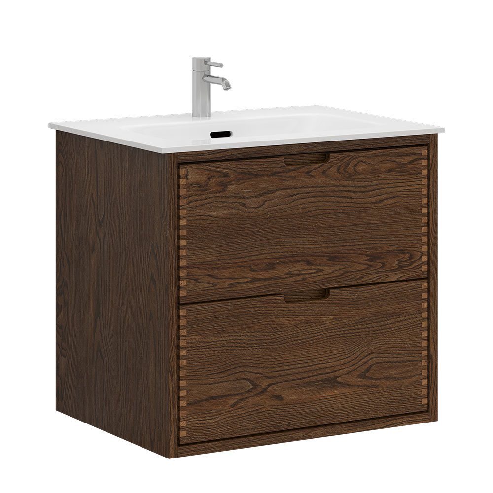 Denne elegante møbelpakke i mørkolieret eg er det perfekte valg til ethvert moderne badeværelse. Pakken er delvis massivt eg og delvis finér.