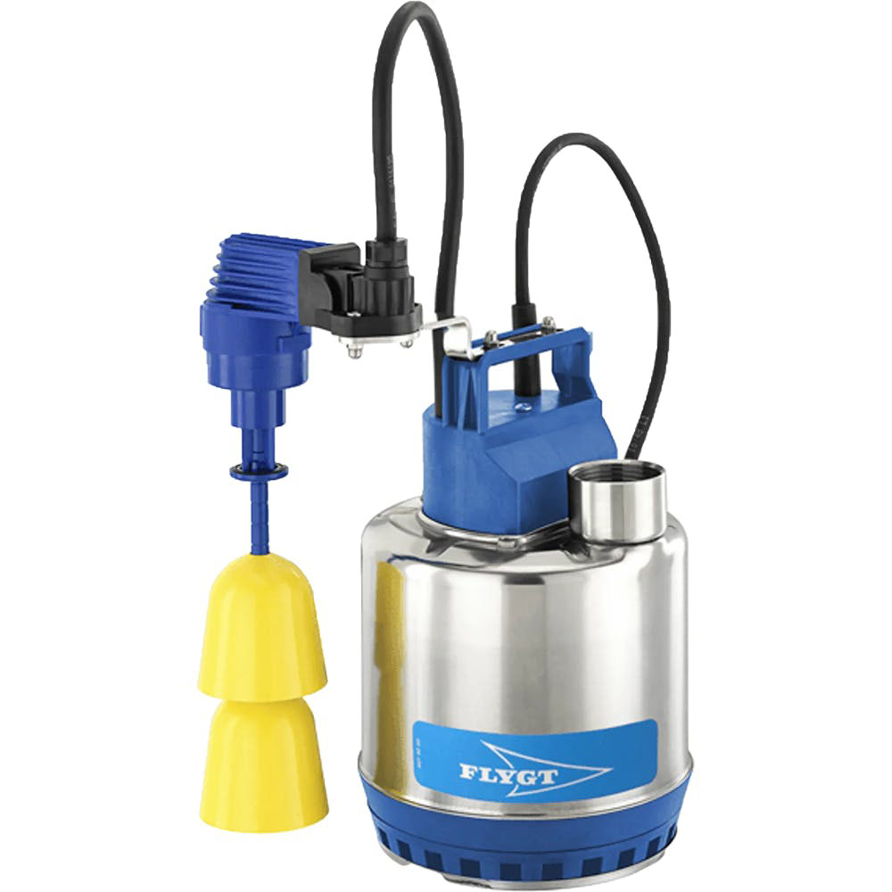Flygt SX dræn- og lænsepumpe med niveauflyder-enhed, kan udpumpe gråt spildevand fra vaskemaskiner, vaskekældre osv. med faste partikler op til 10 mm.