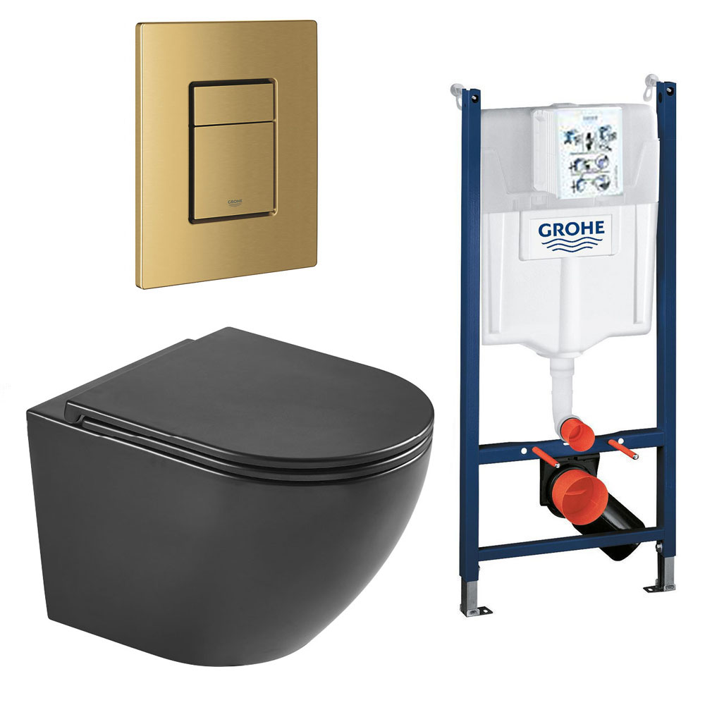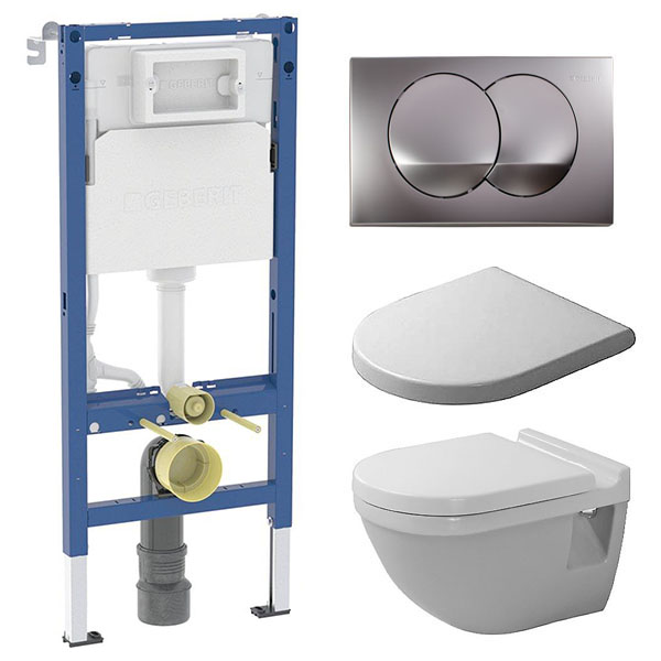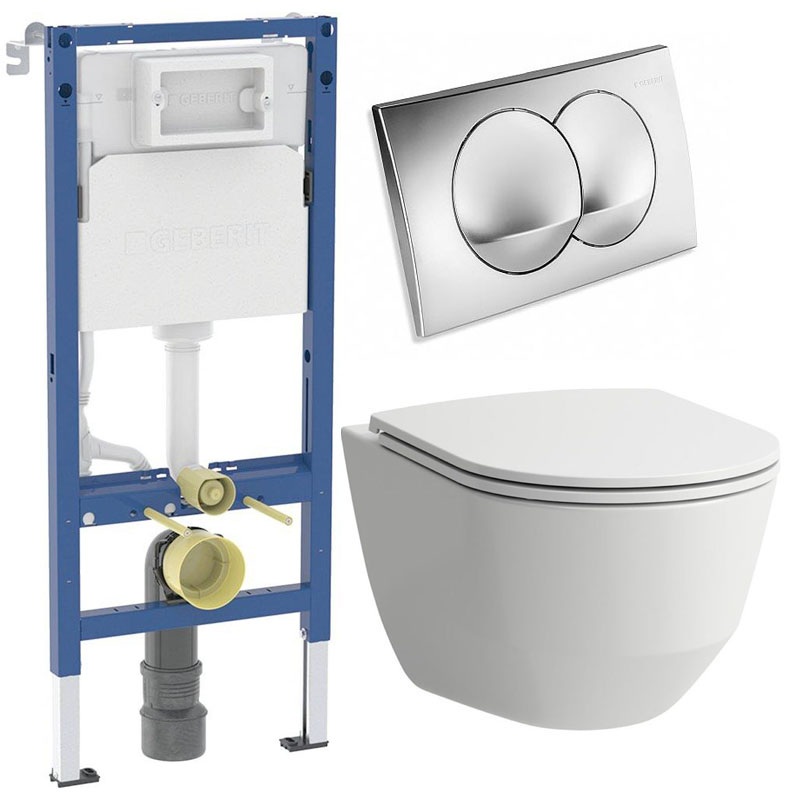 Komplet toiletpakke med Aqua flush, vægtoilet og Soft Close sæde samt Geberit cisterne og trykknap i hvid/guld