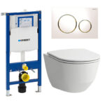 Forny dit badeværelse med denne komplette toiletpakke, der indeholder et Laufen vægtoilet og sæde samt en Geberit cisterne med trykknap i i hvid/guld.