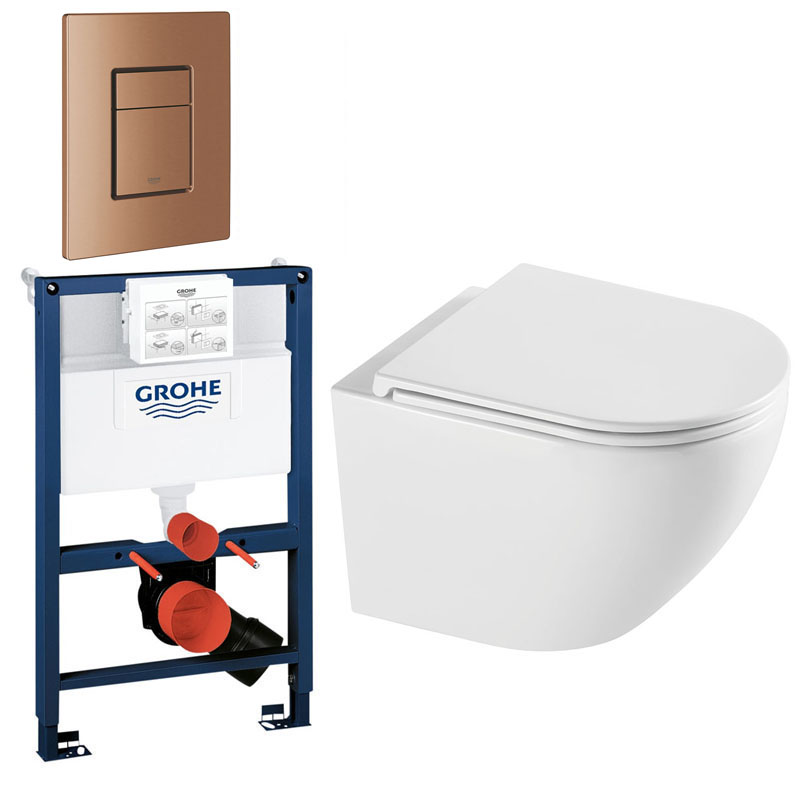 Leveres inkl. Slim toiletsæde med soft close og quick-release. Cisternen er fra Grohe og har en højde på 82 cm. Trykpladen er i PVD kobber farve.