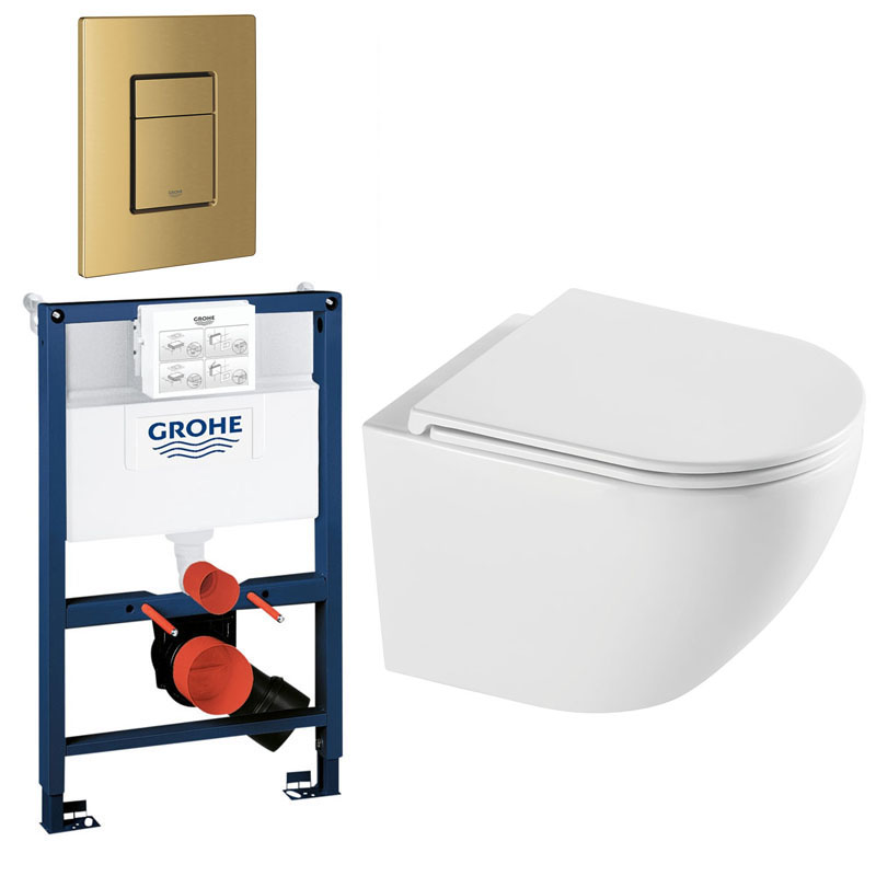 Leveres inkl. Slim toiletsæde med soft close og quick-release. Cisternen er fra Grohe og har en højde på 82 cm. Trykpladen er i PVD messing.