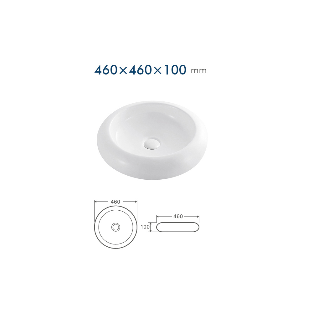 Denne vask er fremstillet i glat, hvidt porcelæn af høj kvalitet. Den runde form måler 460 mm i diameter og 100 mm i højden, hvilket gør den ideél til montering på en plan bordplade. Uden overløbsåbning og uden forudmonteret hanehul får du et rent, enkelt design, hvor armatur og bundventil kan vælges frit for at matche din stil og funktion.