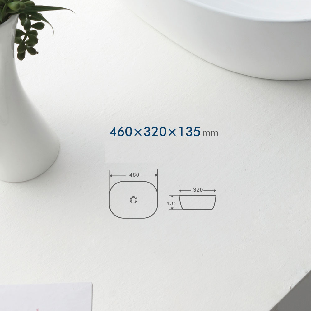 - Kompakte dimensioner: 460 mm bred × 320 mm dyb × 135 mm høj – giver god plads til håndvask uden at dominere bordpladen