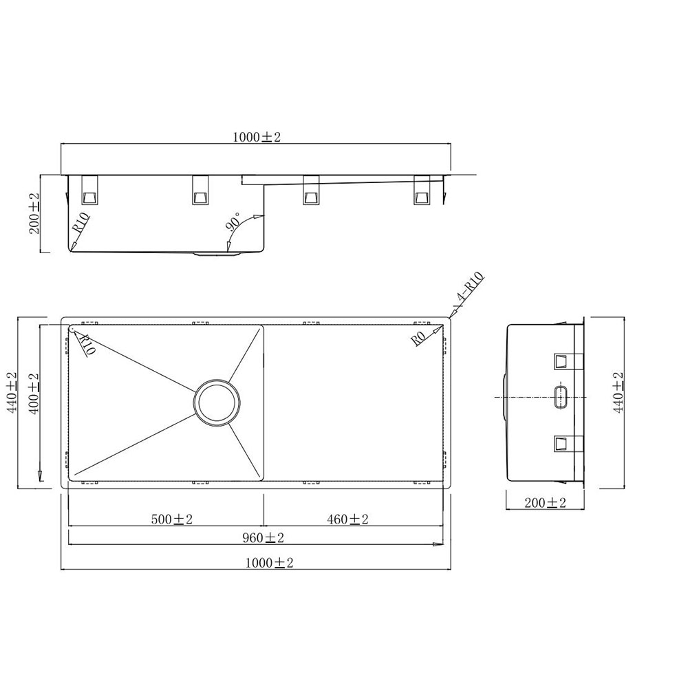 Med sine mål på 1000×440×200 mm giver vasken masser af plads til opvask af gryder, fade og bageplader, mens den integrerede drypbakke sikrer, at vand fra opvask og rengøring effektivt ledes væk.