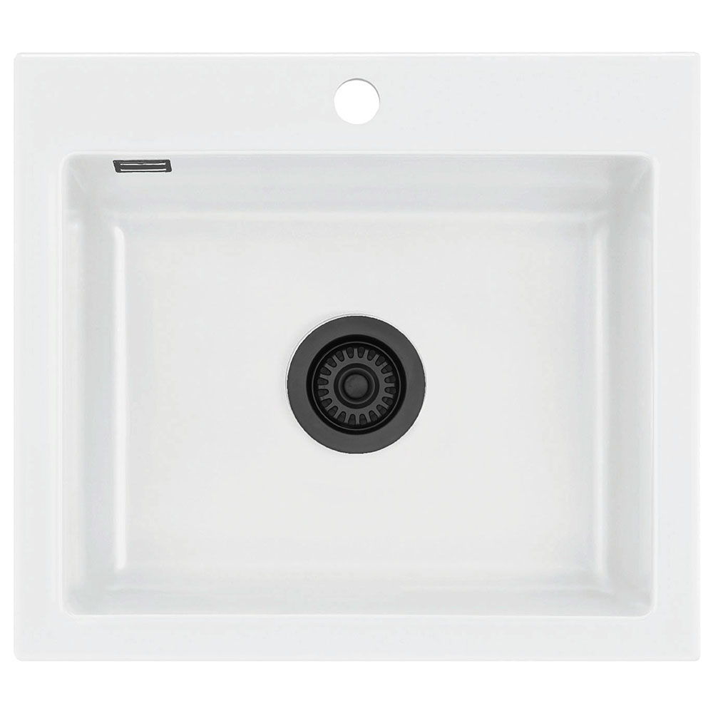 Mera 57 Hvid keramik køkkenvask t/nedfældning m/hanehul, m/sort afløb fra Lavabo.