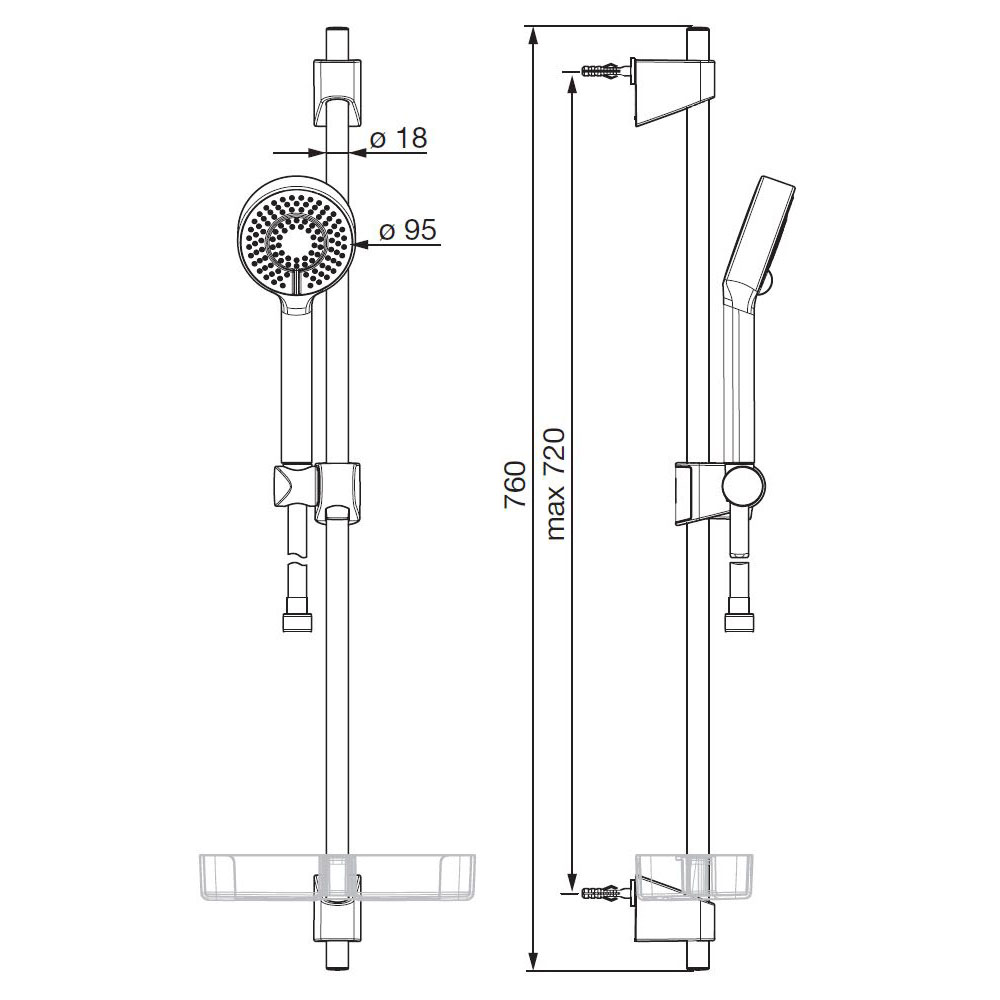 Oras Apollo brusersæt Ø95 mm håndbruser med anti-kalk funktion, 3 stråletyper, justerbar bruserstang max. 720 mm, 1750 mm bruserslange og sæbeskål.