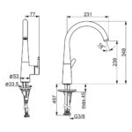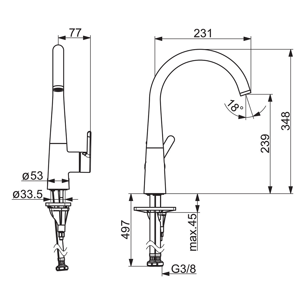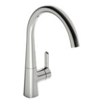 Køkkenarmatur med høj svingtud. Tudens svingradius er forindstillet til 120° (kan begrænses til 0° eller 60°). Mulighed for begrænsning af temperatur og vandmængde på kartouchen.