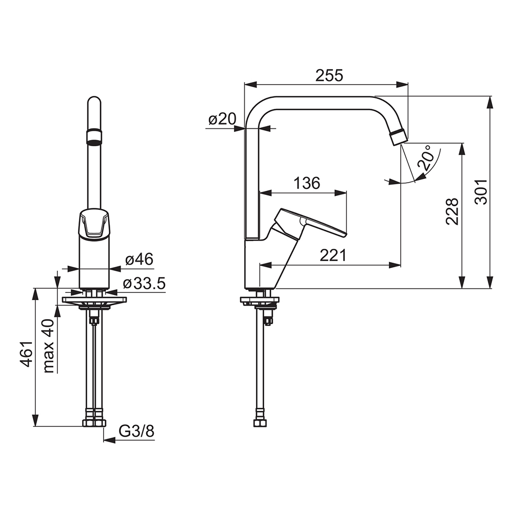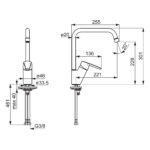 Køkkenarmatur med Eco-kartouche og koldstart. Høj svingtud. Eco flow op til 9l/min. Tudens svingradius er forindstillet til 120° (kan begrænses til 0°/60°). Indbygget begrænsning af temperatur og vandmængde.