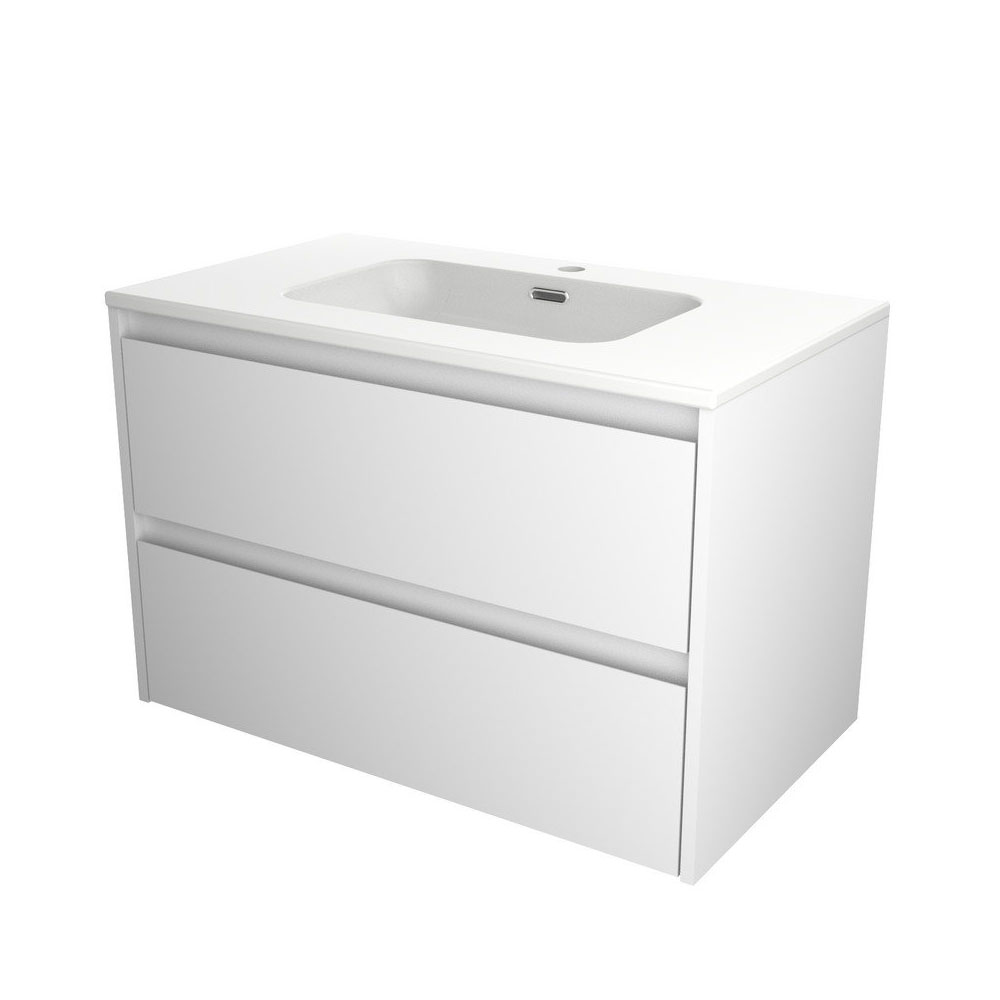 Sanibell Proline møbelsæt 80x46cm i mathvid. Består af skab med 2 grebsfrie softclose skuffer og håndvask med hanehul. Varen leveres i 2 kolli: håndvask 0300142 og møbel 1227052
