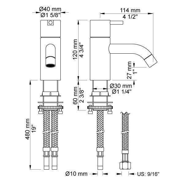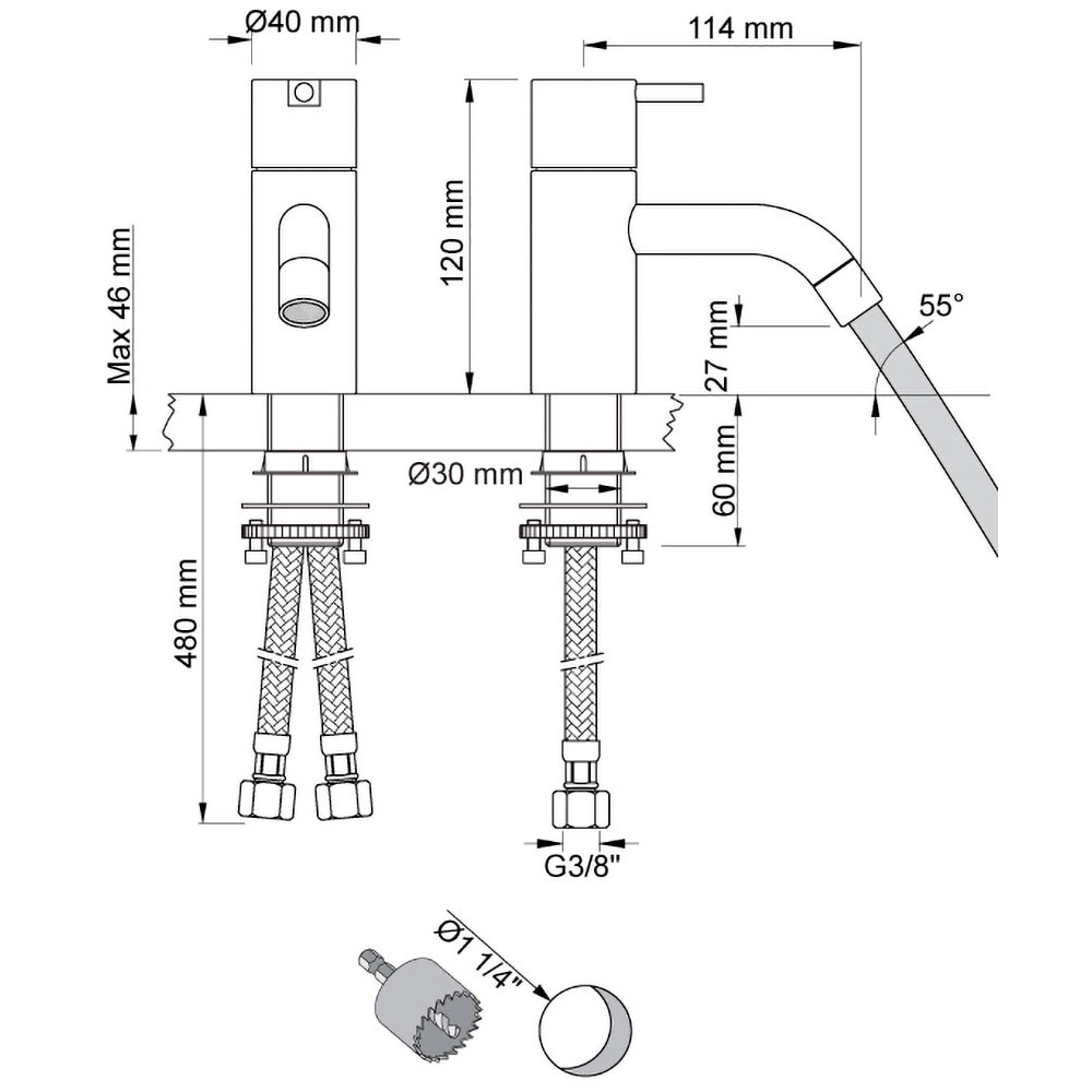 Bemærk: Hvis der i forvejen sidder kuglehaner eller stopventiler med 1/2″ gevind, hvor slangerne fra armaturet skal tilsluttes, er det nødvendigt at tilkøbe 2 stk. spidsmuffer, da tilslutningsslangerne er med 3/8″ omløbere.